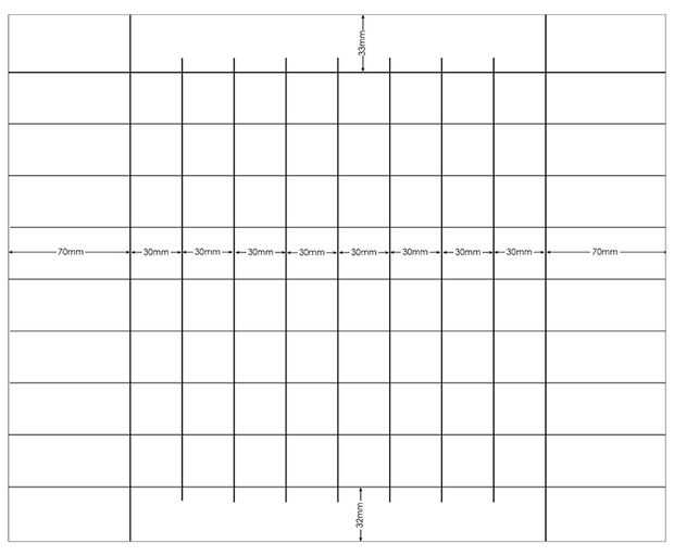E. trabajo de arriba a abajo a partir de la línea de 33mm y dibujar líneas horizontales en el 63, 93, 123, 153, 183, 213, 243, 273 m m.