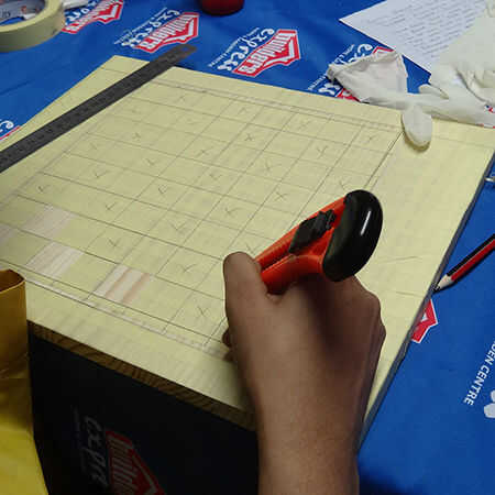 Ahora utilizas una regla de acero y lápiz para marcar fuera de las líneas para el tablero de ajedrez.