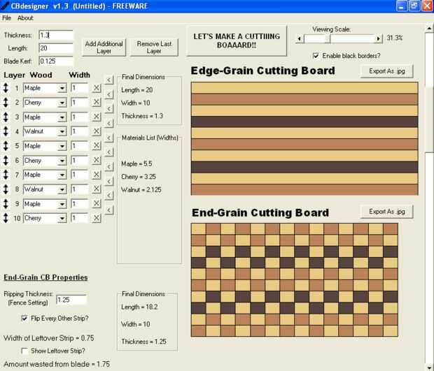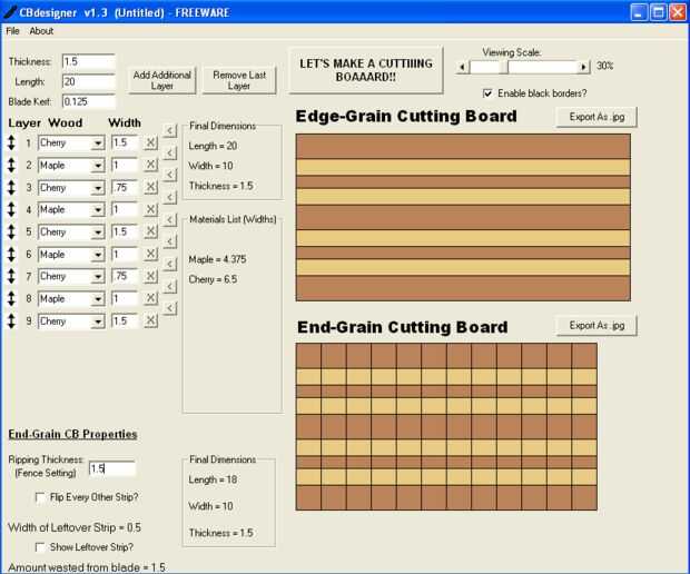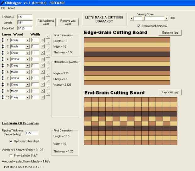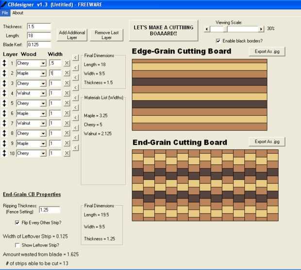 Si juegas con la configuración de cualquier diseñador de CB, también puede crear diseños un poco más complejos - por ejemplo en la última fotografía que he creado un patrón escalonado, cambiando el ancho de una franja de arce de 1 pulgada a 1/2 pulgada. Además de ayudarle a plan un patrón CB diseñador ayuda a plan qué longitud a cortar la madera, cuántos cortes le deba efectuar, y cuánta madera se utilizarán el proceso de corte.