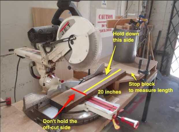- Compruebe la longitud de la pieza guardada. Una vez que estés satisfecho con la longitud, lugar / abrazadera de un bloque de tope en el borde para medir todas las otras piezas a la misma longitud. Si uso compartido vio como en Techshop, comprobar que el ángulo es 90 grados y el ángulo del bisel se establece en 0 grados.