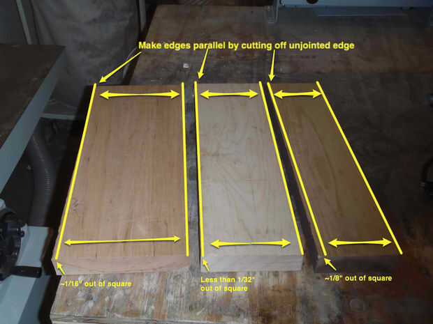 - El borde del tablero de alimentación a través de la ensambladora, haciendo los mismo cortes finos. Repita hasta que una cara es recta y lisa. El borde opuesto debe limpiarse en la Sierra de mesa - a menos que ambos bordes están perfectamente paralelos, ambos bordes de la articulación sólo agravarán las imperfecciones existentes.