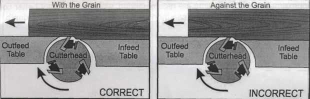 - Coloque la cara articulada hacia abajo contra la cama de cepillo, con el grano hacia adelante de la herramienta de corte.