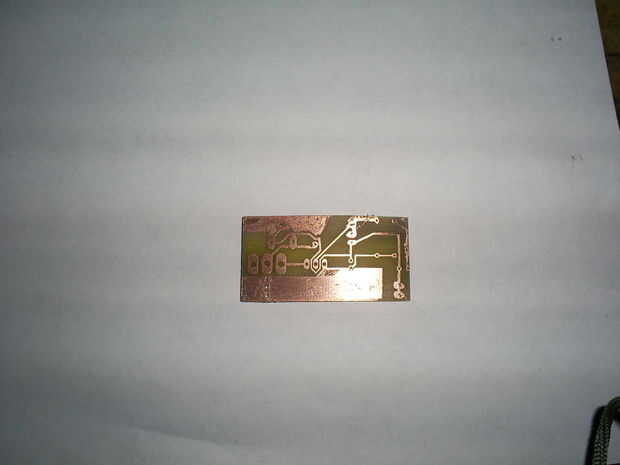 Ahora, si se utiliza un diseño diferente, suya puede ser diferente. Tenga en cuenta que el PCB no salió tan bien. He estado teniendo realmente mala suerte últimamente de hacer cosas y no 3 veces antes de esto antes de que lo conseguí. Normalmente soy bastante bueno en la fabricación de PCB con papel fotográfico de grapa y un chorro de láser, pero este sólo mantuvo deslizarse cada vez que aplica el hierro (incluso con cinta!). La mayoría de los rastros vino a aceptar, salvo las huellas más grandes en la parte superior e inferior de la Junta.