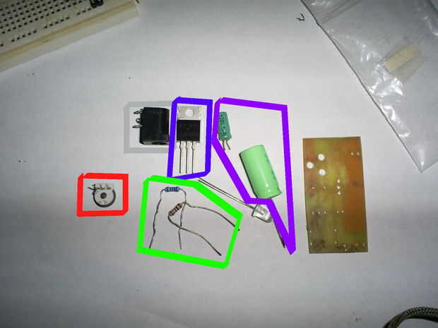 1 1uF 16V condensador (opcional también)-misma razón, utilizado para ayudar a la regulación. (caja morada)
