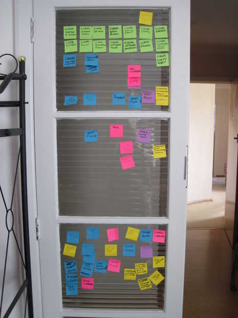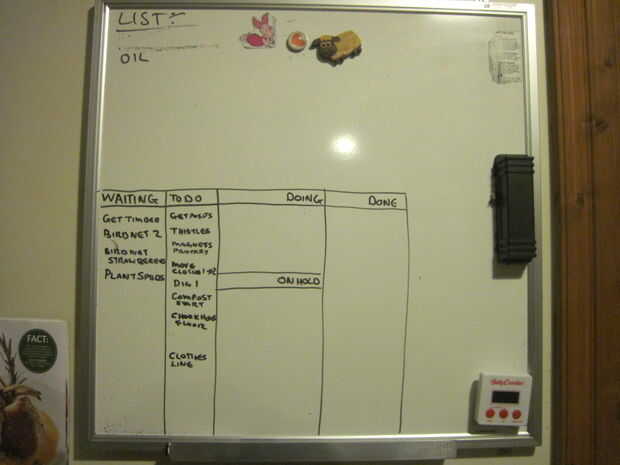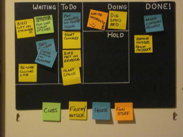 Kanban fue diseñado para ayudar con el flujo de tareas en la fábrica de Toyota de la fabricación pero puede ser adaptado a las tareas personales para ayudarle a organizar su vida. He estado usando Kanban en el trabajo durante 12 meses. Un par de meses atrás usé un simple tablero Kanban para ayudarle a organizar el movimiento de la casa, esto fue hecho con tres paneles de la puerta del estudio. Después de una charla muy inspiradora por Sandy Mamoli decidí crear mi propia placa basada en sus diseños. Ahora traigo lo Inicio para ayudarle a organizar la gran cantidad de trabajo la nuestra granja pequeña, lleva un pack de cub scouts y vida en general.