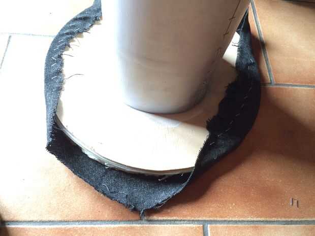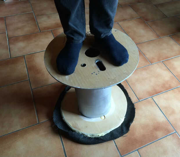 Coloque a la tela en el piso, centro de la espuma en ella y poner el tambor de arriba hacia abajo. Ahora necesita aplicar presión en el tambor para comprimir la espuma para obtener la tela bien tirante, una vez que se fija. Puedes poner objetos pesados sobre él, pero la forma más sencilla de hacerlo es preguntar a un amigo para colocar en ella (tu amigo no tiene que ser pesado).