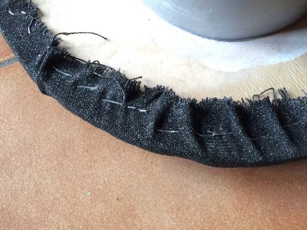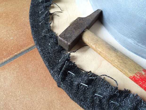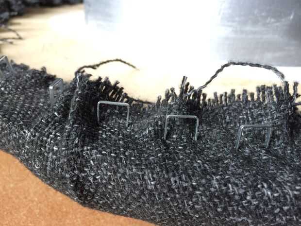 Porque la tela es un poco más grande que el diámetro del tambor, puede verse colgando suelto (como en la imagen). Si es así, utilice el cortador de la caja para quitar esas partes, pero no corte demasiado cerca de las grapas o puede aflojar a la tela entera.