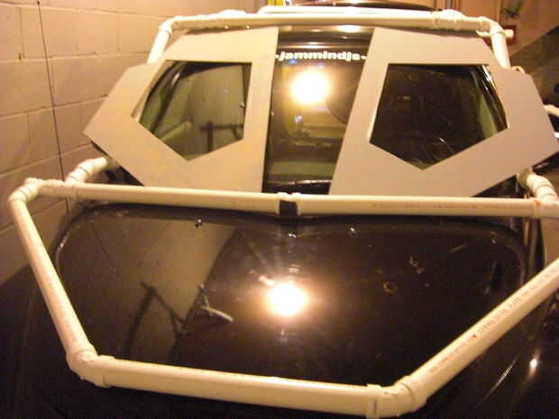 El patrón de cartulina fue transferido a la tabla y cortar con una sierra circular. Después de cada corte, usaría algún papel de lija para suavizar el borde. Luego las piezas fueron empernadas a la estructura de pvc.
