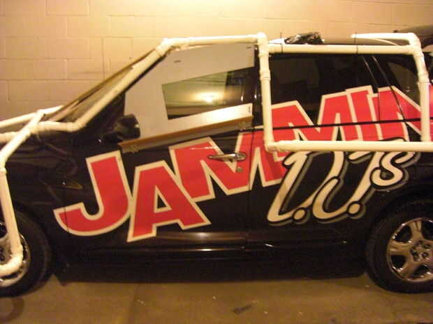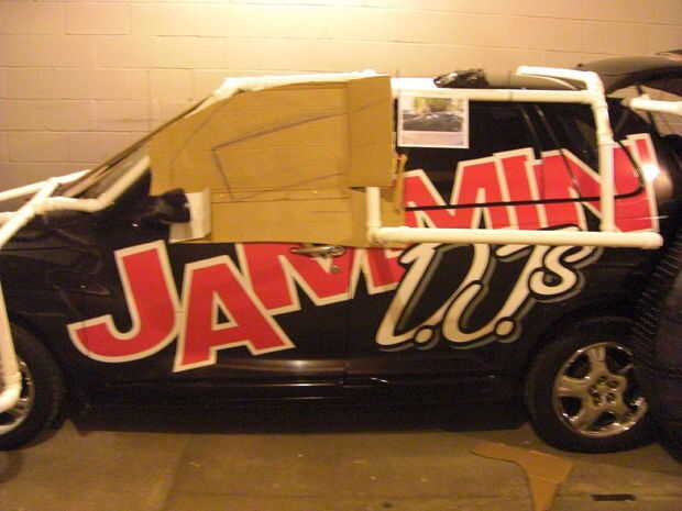 Una vez más, la forma básica fue bosquejada en algún cartón de desecho, trazada y corte de la madera prensada.  El panel fue atado con la cuerda que fue la puerta del coche y atado al resto del brazo de la puerta interior.  La parte del estante estaba relacionada con el espejo lateral de apoyo.  Continuamente se abra y cierre la puerta para comprobar si había suficiente espacio.