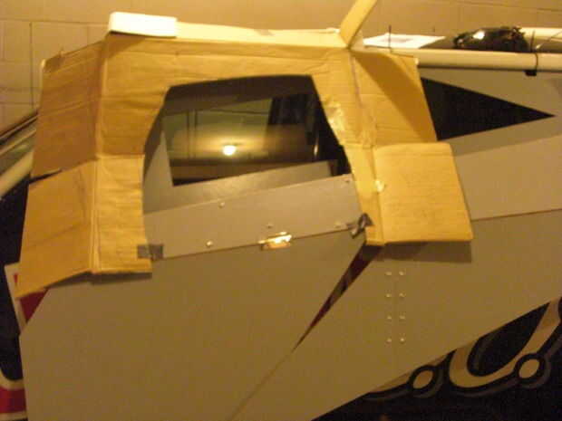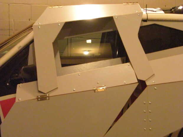 Las bisagras de estas piezas fueron instaladas para que los paneles podían doblar hacia arriba y fuera del camino para hacer espacio para la puerta del conductor abrir.   Ya que estas secciones se le mueve mucho, es importante que se hicieron fuera de la tabla resistente 1/4".