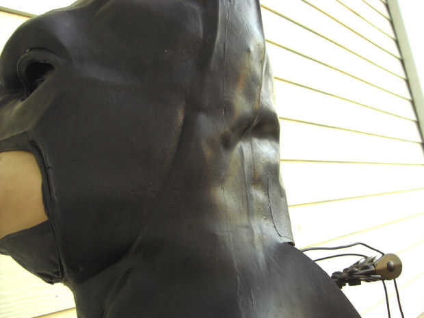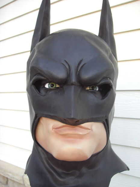 Necesitaba una cara con una mandíbula fuerte, así que compré la máscara de Superman de los niños por $20, había pintada de negro alrededor de los ojos y llena los zócalos del ojo con los ojos de acrílico para $10. Un marco esquelético de pvc (imaginar una figura de palo) lo mantiene en su lugar encima de una caja de madera personalizada que albergaba un motor oscilante de una lámpara rota dj. Lo hice para que la cabeza podría pivotar en el cuello y enganchado hasta el motor de la base con algunos cables sobre algunas poleas viejo (que sobra después de ser cortado fuera de los paraguas del patio para hacer la pantalla de mi UFO el año anterior).