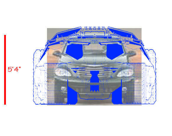 En Photoshop, superpone las huellas azules encima de fotos del crucero. Luego estirado, encogido y trasladar piezas a obtener para que quepa el coche. Tuve que dejar espacio para los espejos laterales, compensar la campana, la nariz y asegúrese de que el eje trasero se sentaría sobre el parachoques trasero.