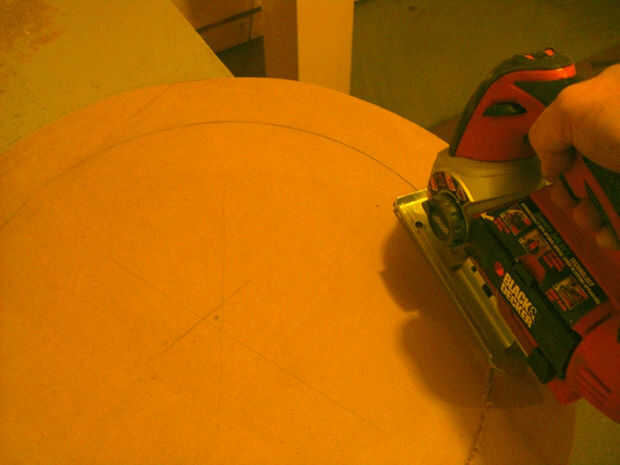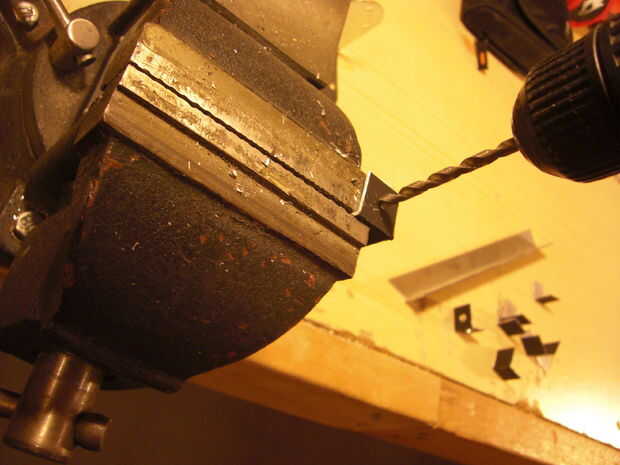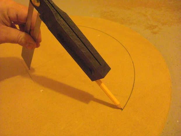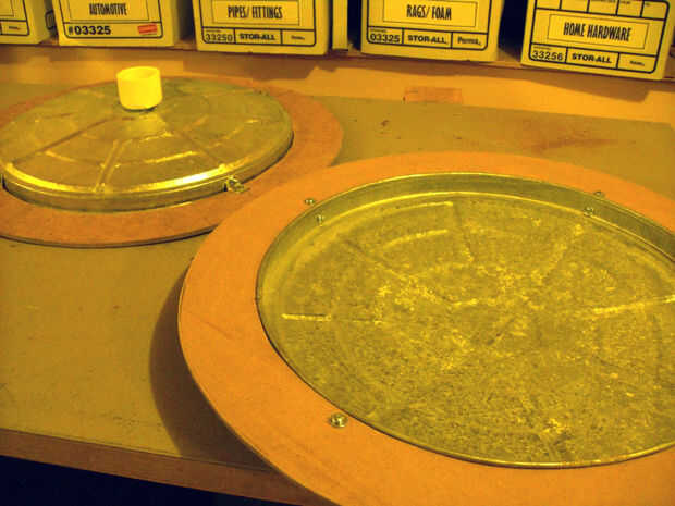 Usé una herramienta de ángulo (un must-have para todo el proyecto) como brújula dibujar un anillo de chatarra 1/4" madera (Foto 1) y cortar el patrón con una sierra de calar (cuadro 2).  Hice algunos remaches pequeños 90 grados de aluminio de desecho usando un tornillo de banco y taladro (Fig. 3) y utilizado para sujetar los anillos a algunas viejas tapas de basura (Figura 4).  Se muestran la parte delantera y trasera de cada rueda delantera montada y un 1-1/2" pvc tapa se enroscan en el centro de la espalda.