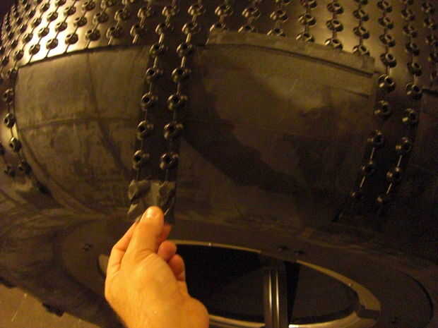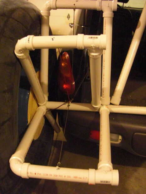 La rueda trasera (cubo) se ajusta en el agujero del centro del tubo interno y se conecta el eje trasero (un pedazo de 1-1/2" tubo de pvc atornillada al cerrojo de la escotilla trasera). El marco de PVC (realizado junto con pequeñas cuerdas del amortiguador auxiliar) se utiliza para mantener el neumático en su lugar sosteniendo los peldaños.