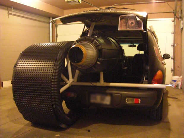 El motor cohete estaba hecho de un bote de basura de plástico negro ($11) y un antiguo titular de planta acanalado plástico (gratis) pintadas con cromo y pintura de aerosol de cobre. Un agujero fue cortado en la parte inferior de cada uno antes de que se atornillan juntos. Una impresión de la foto de la parte posterior del vaso original fue grabada en la portezuela trasera de referencia.