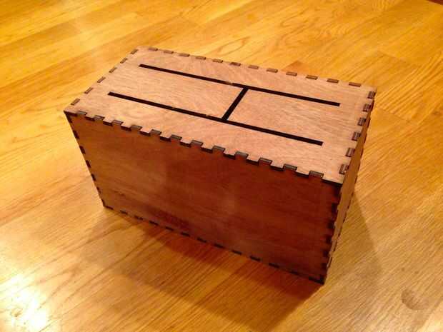 Un tambor de registro consiste en una caja resonante con una llamativa superficie con dos fichas diferentes de tamaño. Las dos lengüetas producen dos notas diferentes cuando se golpea. Este tambor de registro fue diseñado como un conjunto de placas que se enclavija en Inkscape y luego cortar con un cortador láser.