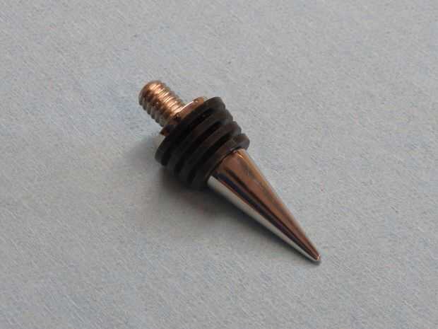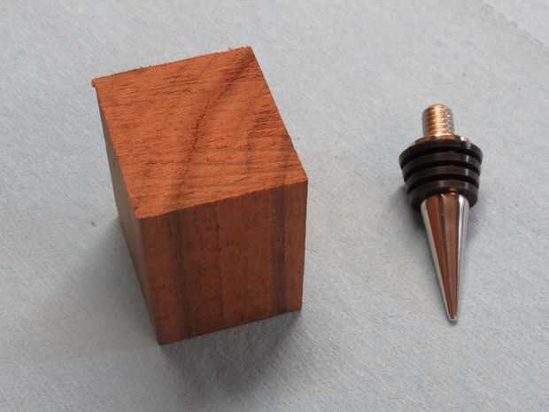 El Mini tapón de la botella es de Rockler, madera no incluida (Foto 2). Mayoría de tiendas de madera venden la madera por separado y ya cortada a la medida del tapón de botella. Recomiendo el tapón de la botella de acero inoxidable, ya que no corroe ni reacciona a los vinos como otras galjanoplastias. Los recubrimientos de cromo reacciona a algunos vinos. El tapón de la botella Mini tiene un vástago roscado y sus dimensiones son de 3/8 pulgadas X 16 TPI (roscas por pulgada).