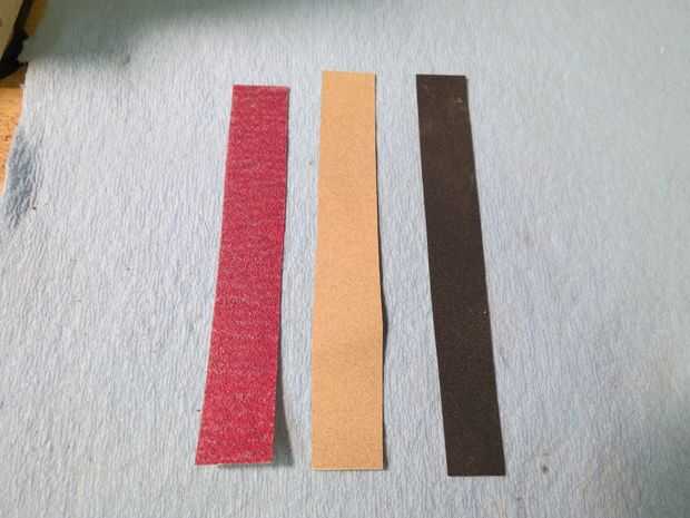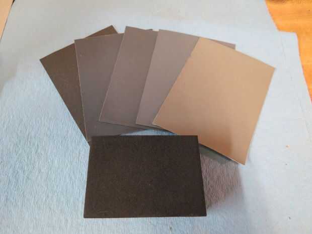 Papel de lija - 120, 220 y 320 granos en tienda de mejoras para el hogar (foto 4). Pads de malla micro de Woodcraft o Hobby Lobby (Foto 5).
