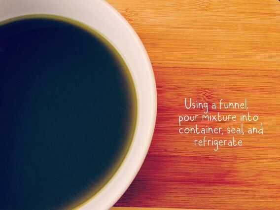 Usted querrá usar un embudo para verter la mezcla en un recipiente que puede ser sellado y refrigerado. Beber mucha agua mineral, por lo que en el nombre de ser respetuoso del medio ambiente que he limpiado las etiquetas fuera una antigua botella de vidrio y almacenan mi concentrado en eso.