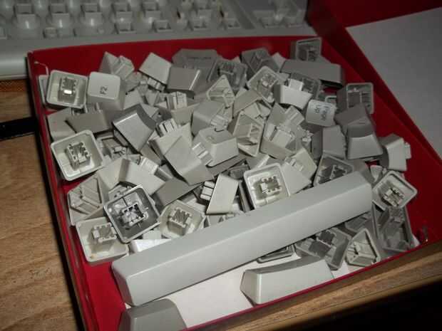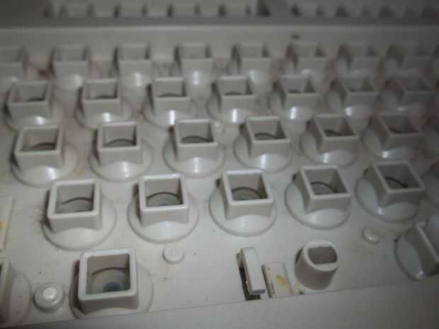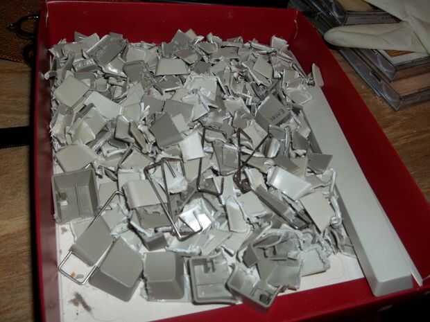 Continuar a la siguiente clave en línea, "F1" y repita las instrucciones de arriba. Pasar a "F2", etc. hasta que todas las teclas han sido despojados y reducidos a pedazos poco aparentemente inútiles. (A utilizarlos más adelante, así que asegúrese de que cada uno va detrás en su propio agujero!) Nota: Cuando usted cortar los extremos de la barra espaciadora, salvar ellos. Los necesitarás más adelante.