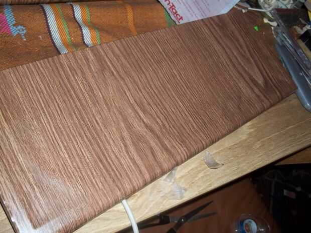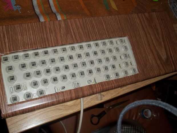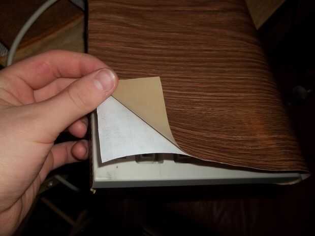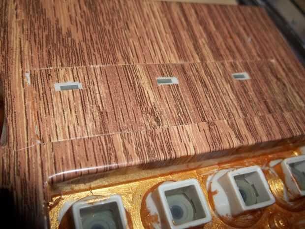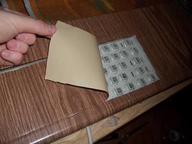 Cuando lo hayas hecho, empezar muy cuidadosamente pegando el papel al teclado - por primera grabación un extremo a la base posterior de la Junta y luego despegando lentamente una o dos pulgadas del respaldo en un momento y alisar en. Continúe alrededor de esta manera hasta que estés cerca de dos pulgadas de la cuerda. Hacer una pequeña ranura para el cable y poner abajo la última del libro.