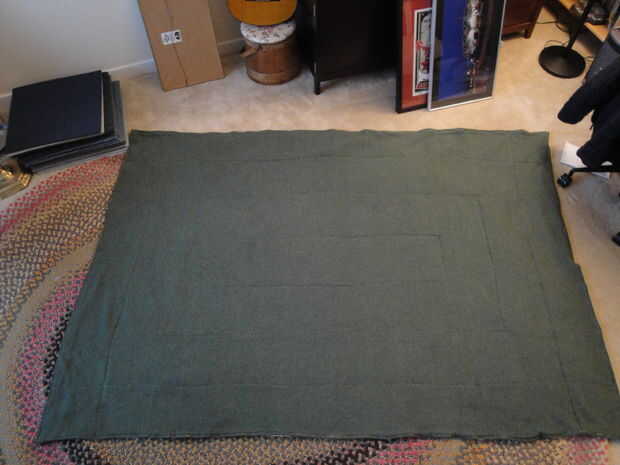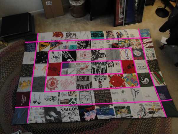 Con puntada recta, cose la parte delantera a la parte posterior el patrón indicado en la segunda foto por las líneas de color rosa. De la parte posterior esto se verá como un patrón de rectángulo concéntrico.