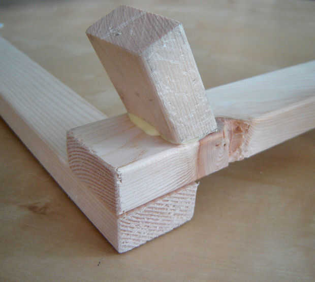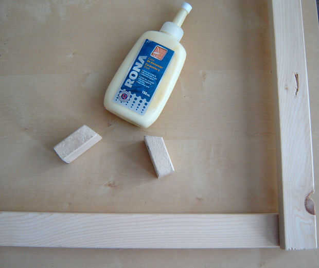 Con las patas traseras en posición vertical marca el ángulo para cortar las patas delanteras.  Una vez que corté las patas delanteras con una sierra había pegado sobre el marco con pegamento para madera una pulgada y media desde el final.