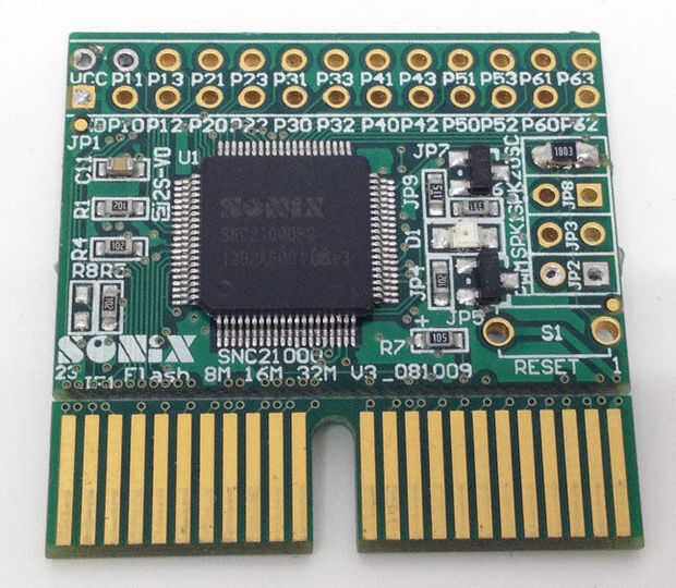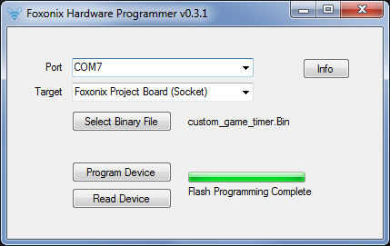 Después de que has actualizado tu programa y eres feliz con cómo todo suena, puede cargar el programa en un proyecto para instalar en la vivienda. Una de las cosas super cool de Foxonix es que la Junta de desarrollo tiene el conector de programación incorporado, para que pueda simplemente enchufe la Junta en ese conector y cargar el código. Ahora tienes un stand pequeño, solo PCB con su programa y audio en él, que es perfecto para poner en proyectos.