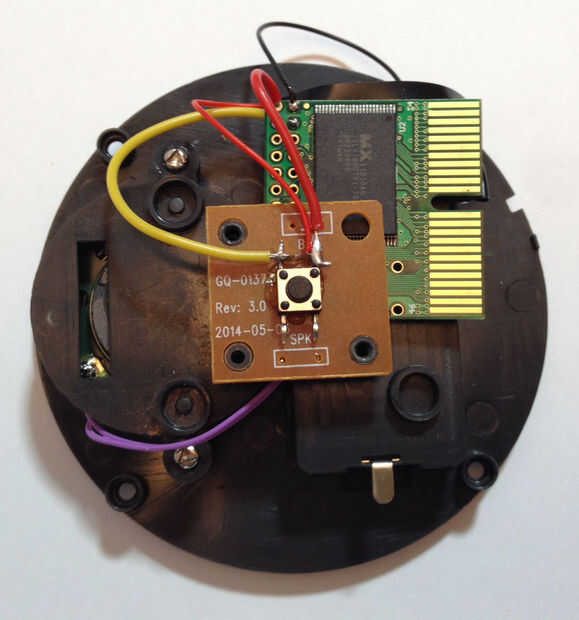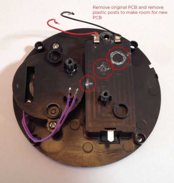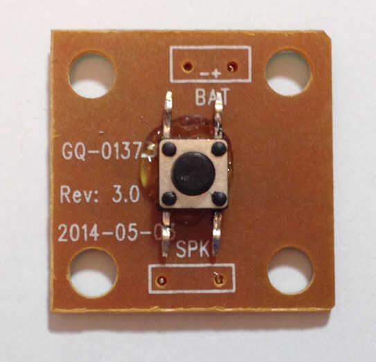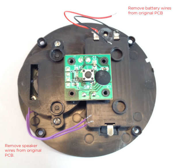 Para empezar, desconecte la batería y cables de altavoces que están conectados a la PCB original. Retire la placa original de la carcasa y quitar el botón de dicha junta. Intenté utilizar el pulsador mientras que todavía fue conectada a la placa, pero no funcionó a causa de los otros componentes todavía conectados a él. Así que en vez he quitado el botón y caliente lo había pegado al centro del otro lado del PCB. Este PCB ya tiene tornillos y agujeros de montaje por lo que deseamos reutilizarla.