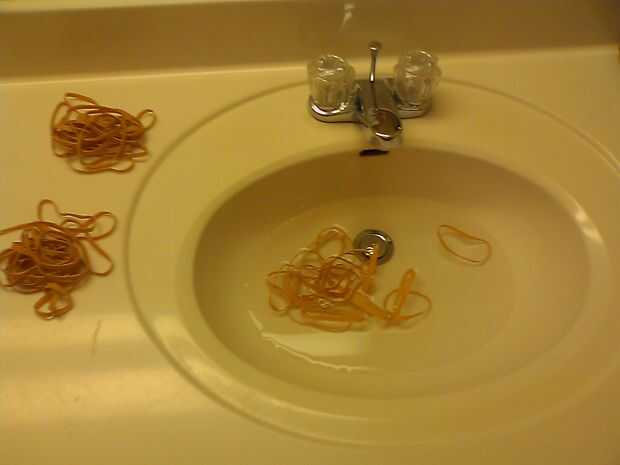 Las gomas se dividen en tres montones incluso y tirar uno de los pilotes en el fregadero. Lubricar con agua va a facilitar su nudo juntos