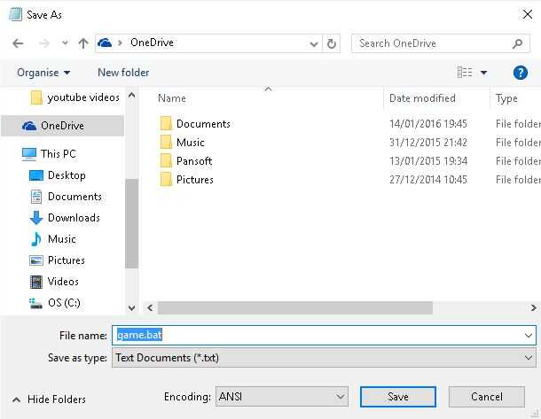 Al guardarlo para jugar guardarla como un archivo .bat tan por ejemplo al presionar guardar y lo ponga algo como game.bat.