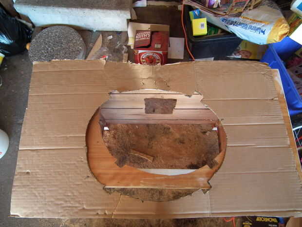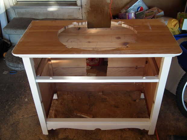 Encontrar un pedazo grande de cartón corrugado u otro material rígido como el tablero de la pared. Hacer una plantilla para el fregadero. Use una navaja para cortar el patrón. Coloque el patrón que cerca del centro de la dresser y use una sierra de vaivén o router para recortar el agujero. La parte superior de este era muy gruesa usé un router para que sea más fácil. También no te preocupes si estás apagado un poco ya que el contador cubrirá hasta los errores menores que hace con el agujero para el fregadero. Después de que termines prueba montar el fregadero y hacer los ajustes necesarios.
