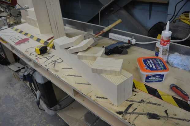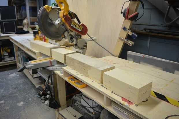 Hubo una gran cantidad de longitudes de 3/4 capas. Pegados y presionados juntos, luego corona con grapas, que hicieron para muñones de piernas gruesas agradable. La capa era bastante duro y poroso por lo que presionó a un montón de relleno de madera en los bordes, luego lija suave. Yo también