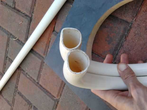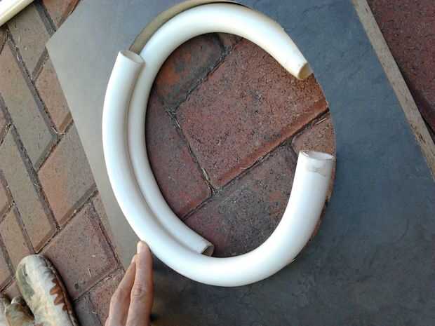 Usted encontrará que los extremos de la media luna se deforman debido a la manipulación. De cada extremo, corte la mitad de lo que fue agregado (es decir, 100mm/2 = 50 mm). Ahora debe tener dos semicírculos. Pegamento junto con "Cemento para PVC" para obtener su toro!