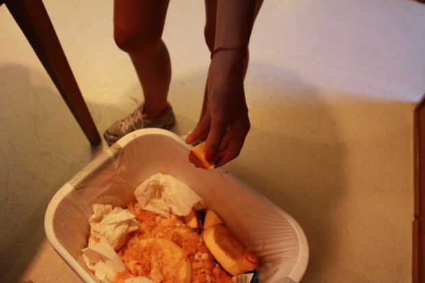 Use el cuchillo para recortar el diseño. Tirar los pedazos de calabaza a la basura.