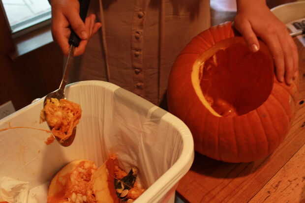 Con la cuchara grande, raspar el interior de la calabaza. Tirar a la basura la pulpa y las semillas.