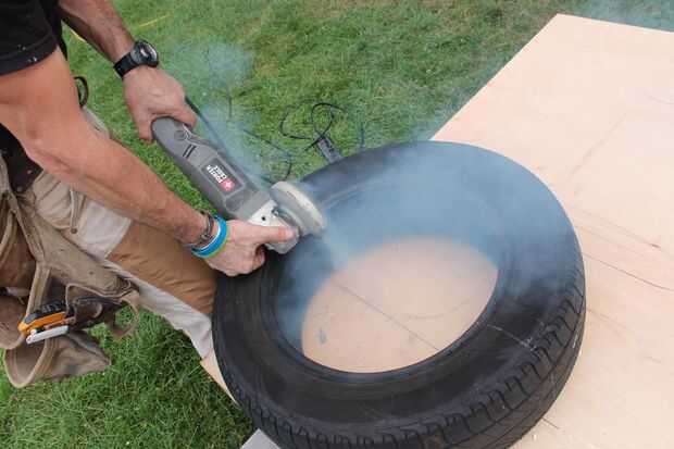 Utilizamos una amoladora con un disco de corte metal para cortar el neumático. Una sierra para cortar ingletes (una sierra de mano circular o incluso funcionará también) para cortar la madera. Que enrutan los bordes con una fresadora y condujo los tornillos con nuestros conductores de impacto (un taladro percutor se hacer muy bien también).