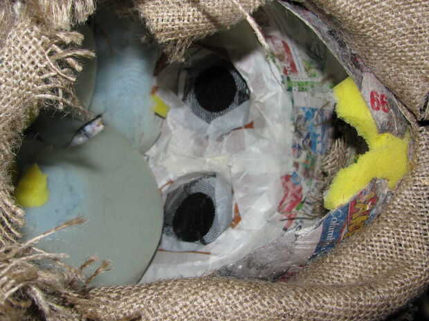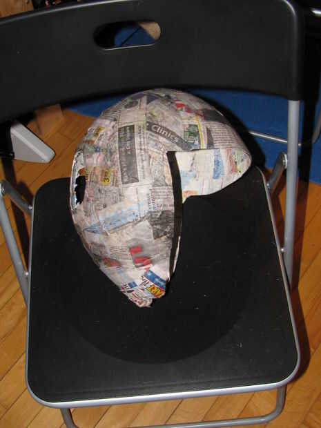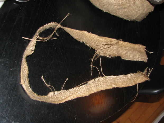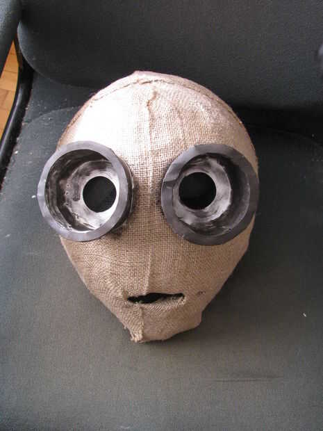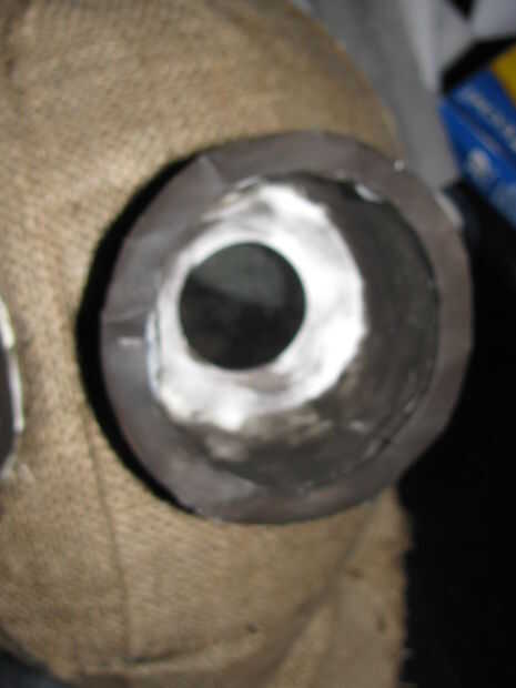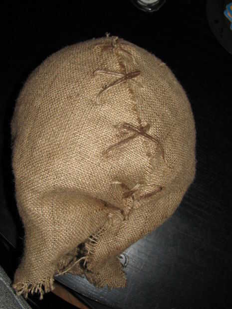 El principal problema de la cabeza es pegar el paño de la arpillera, que tiene que hacer antes de poner en los ojos. la tela tiene que ser cortado en tres piezas... Lamentablemente no tomó ninguna foto en esa parte del proceso como lo fue la última cosa y realmente puro ensayo y error unos 3:00 antes de la fecha (y realmente más error y pegado de las manos que cualquier otra cosa:-).