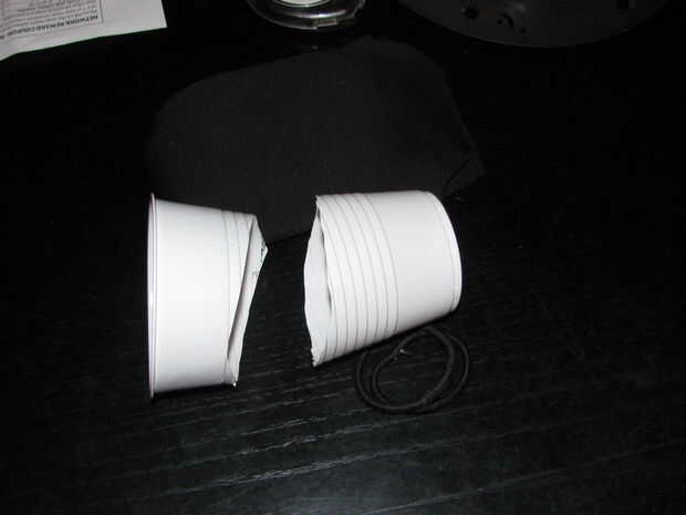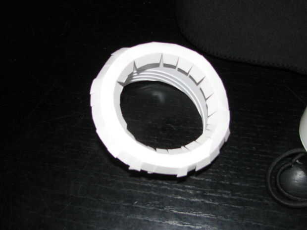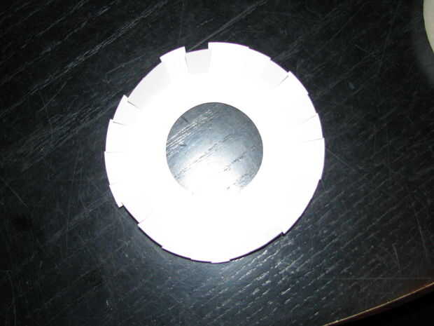 Estos círculos de cartón son básicamente un círculo con un orificio interno, alrededor de 3 cm de espesor. para el exterior uno corta de alrededor de 1cm se realizan en la dirección radial en el interior y fuera del trabajo de los bordes como aletas para ser pegado a la taza de plástico. Por la parte interna del ojo son realizar cortes en el borde exterior para poder pegar como base de la taza de plástico cortada...