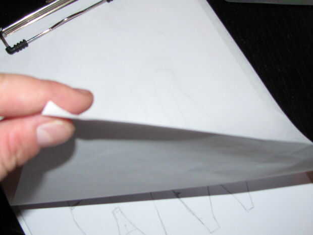 una vez que el ajuste es correcto entonces poner la arpillera en la superficie de trabajo, luego el bocací y entonces el patrón de papel, sujetar todo con alfileres (y cinta de enmascarar y trace el contorno del papel... ya que el ajuste era un poco escaso (no empuje lo bueno me ajuste pernos por mí mismo usando los patrones de papel) es todavía le dio otro 3 cm de aleta margen extra.