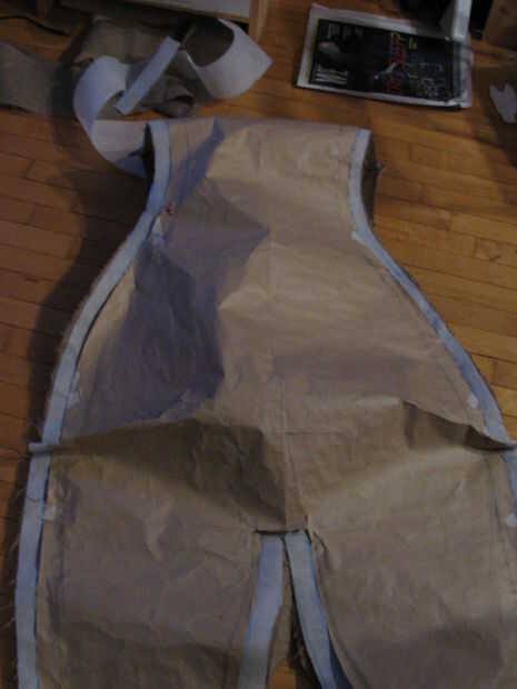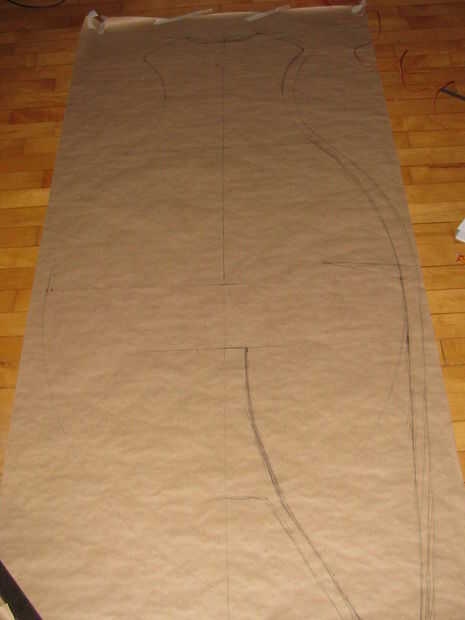 Después de transferir el patrón de la pieza grande del rastro de papel un esquema adicional (unos 2 cm) tras la existente que serviría para dar un margen de maniobra si ajustes son necesarios y también es necesario para usar la cinta de pegamento de tejido. (Por cierto, recordar a construir adentro hacia fuera para el tejido extra y la costura es oculto). Luego cortar el papel siguiendo el contorno externo y usar alfileres para sujetar la parte superior y exteriores piezas de los patrones de papel para que pueda probarlo y ajustarlo...