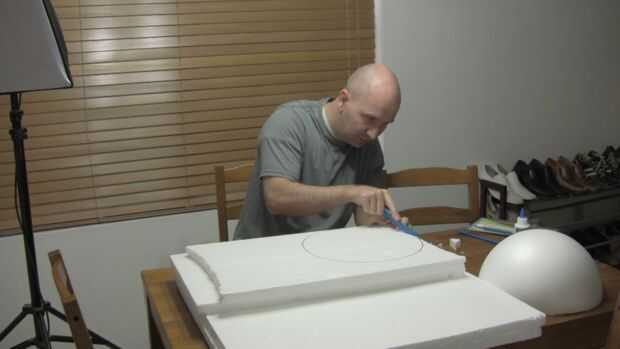 Nuestro primer paso es tomar la media bola de styrofoam y colóquela encima de la pieza plano de espuma de poliestireno. Luego traza alrededor de él con un rotulador. Luego cortamos hacia fuera. Queremos hacerlo con seis piezas. Así tenemos 6 discos. Para un casco de adulto que es. Probablemente un par menos un casco de niño. Y usaría una bola media más pequeña. probablemente un 10 pulgadas uno.