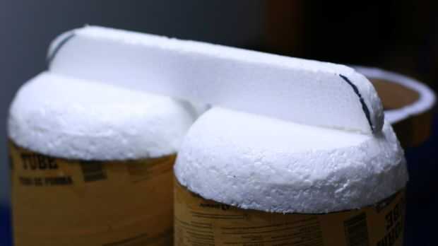 Ahora lo que hice es mi tubo de forma y traza un anillo sobre un trozo de espuma de poliestireno. Cortar ese disco y luego cortar 3 discos más. Tenía cuatro discos de espuma de poliestireno de uno tamaño, entonces yo cortar 2 discos un poco menor por lo que encajaría perfectamente en el interior de los tanques de forma tubos. Pegué todos los tres discos juntos así que tenía dos juegos de tres discos y había pegado a la parte superior de los tubos de forma. La razón de por qué he añadido el disco de fondo es por lo que ayudaría a la cosa de agujero a la tapa del pegamento. Así el disco de fondo cabe dentro del tubo de la forma y los dos mejores discos montar en la parte superior. Siguiente forma de los mejores discos de espuma de poliestireno. Les redondeado un poco con un cuchillo. Luego corte un pedazo largo y había curvado de los dos bordes superiores y había pegado en la parte superior a través de ambos tanques.