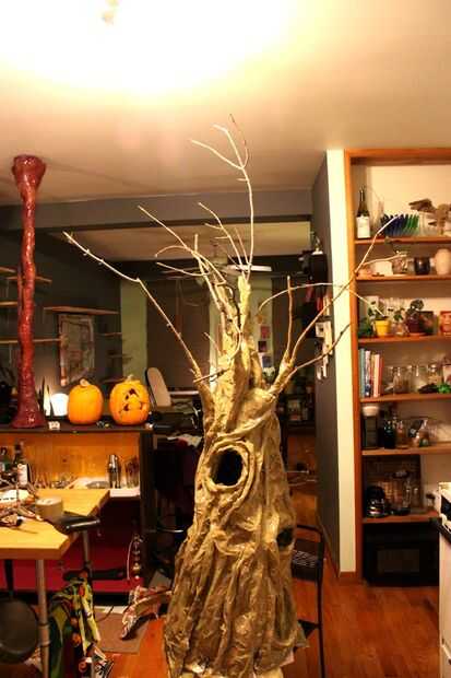 Terminar la grabación de la rama y utilizar el periódico y cinta de embalaje para esculpir corteza, nudos y otros detalles.  Corte hojas de papel y cinta adhesiva en el extremo de las ramas. Añadir cosas animales o cualquier otro personal elementos de diversión. Trasnochar.