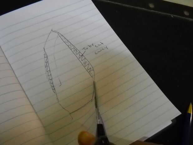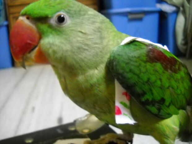 En primer lugar, tomar un cuaderno o grapa juntos dos piezas de papel. Tome su pájaro y le coloque en el papel, él tiene que ser muy dóciles para hacer esto. Tome una pluma de dibujar un breve resumen a partir de su hombro a la base de su cola y repita del otro lado. Si tiene una parte abierta para el frente, trazar una línea recta que conecta ambos extremos de la línea de añadir una pulgada a la longitud. Así que si su contorno es 5inches largo, debe cerrar las líneas de 6 pulgadas. Ahora recorta las formas y mantener cuidadosamente su pájaro como hice en el pic y ver si necesita ser ajustado. Recortar los bordes que parecen innecesarios, pero recuerden que debe mantener el pañal lo suficientemente grande para su pájaro estar cómodo. Lo mismo para la pieza frontal. El siguiente es fácil, cortar una tira larga de tela de aproximadamente 8 pulgadas y cortar por la mitad. Colocar las mitades sobre los hombros de aves y marque donde sostienen las piezas se corta perfectamente. Mantener un extremo en el hombro y marca dónde se debe cortar el otro extremo. Mantener todas estas piezas juntas