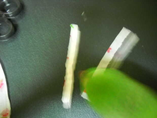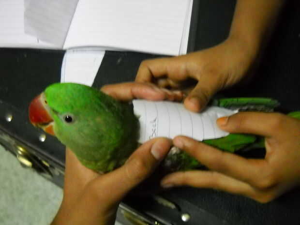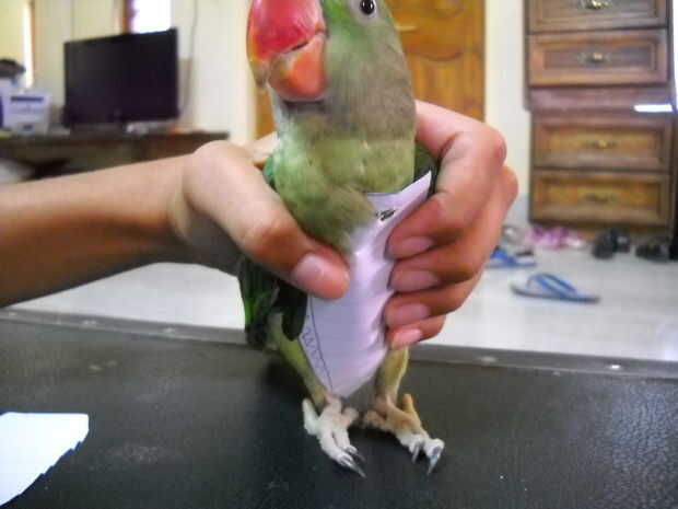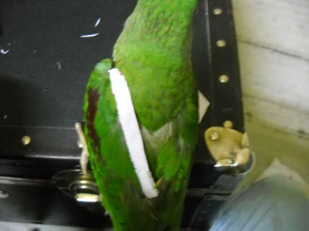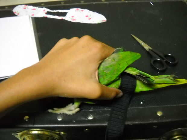 . Finalmente el paso más fácil, tomar el elástico y muy ligeramente se envuelva alrededor base de la cola del loro. Justo por encima de la glándula preen o 1 1/2 pulgada de la base. Recuerda esto es para los pájaros del tamaño de un alejandrino, para otras aves, tienes que medir desde cero.