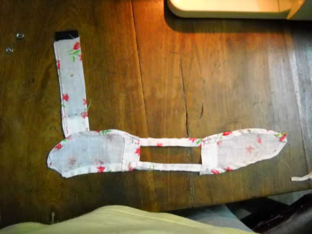 Luego coser el elástico a la pieza de tela de sujeción entre el extremo elástico entre uno de los extremos de la tela, foming un bolsillo dejando libre un extremo. Coser el lado demasiado, luego coser esto a un lado de la pieza frontal.