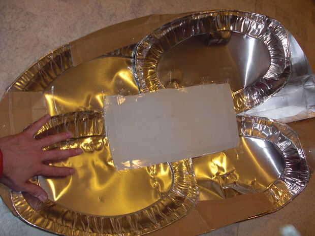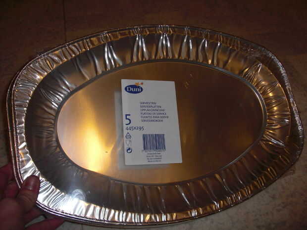 Mary Robinett Kowal promete técnica papel maché «esa voluntad sólo necesita tres capas y puede ser bailada en» así que decidí que use para la base de la concha. Pero primero necesitaba un molde para construir alrededor. Después de altas y bajas en busca de hojas de plástico delgadas y flexibles me topé en estas bandejas de gran porción desechable hechas de papel de aluminio grueso.