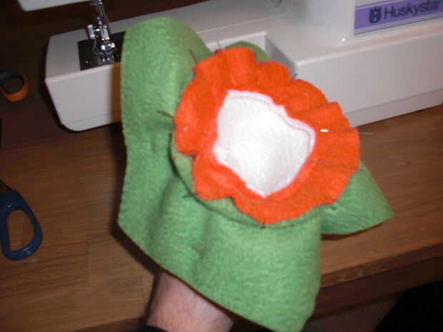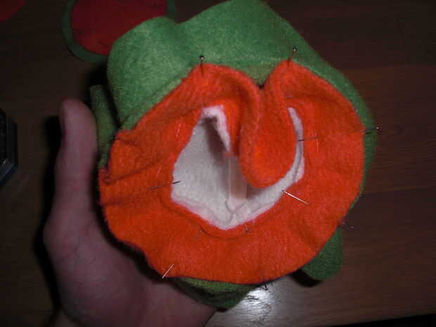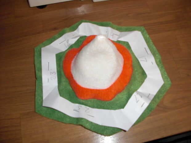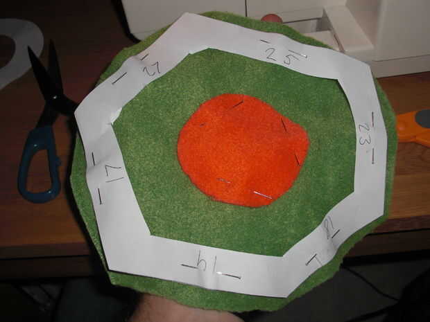Para la espiga real he utilizado un compás para hacer unos círculos que corté pedazos de hasta que me hicieron un cono de aproximadamente el tamaño correcto (lo sentimos, se olvidó de tomar una foto de esa pieza). Entonces necesitaba un círculo naranja, como todos los Koopas picos sobresalen en algún tipo de base naranja. Ese círculo tiene que ser un poco más pequeño que el diámetro del cono sea el margen de costura. Solo haz tu mejor esfuerzo, no es la crítica que es justo. Lo mismo va para el borde exterior del círculo naranja y el agujero del hexágono (chequeen las fotos, es un poco difícil poner en palabras). También, puesto que lo naranja va a servir de base a los puntos significa el agujero en la hexagonal tiene que ser un poco más pequeño que la punta naranja en orden para que "bombeo" ligeramente. Esto significa que si lo haces bien se verá como has hecho un error horrible al llegar a la punción (ver pic para explicación).