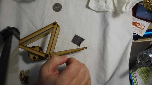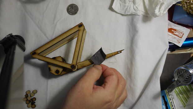 La longitud de las "cuerdas" determinará cómo se dispara su trebuchet. Demasiado corto y sobre todo hasta se. Demasiado largo y se disparará en una trayectoria hacia abajo. Es más fácil empezar demasiado largo y acortar como prueba.